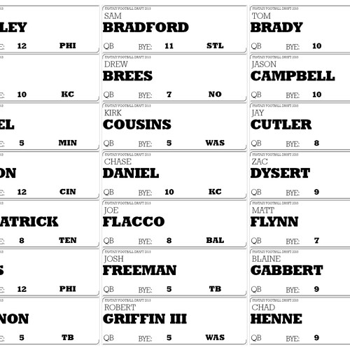 Fantasy football draft board labels. Fantasy Football Draft Board About Fantasy Football Draft Board. Our fantasy football league has remained intact for longer than we'd care to admit: 22 years. These 22 years have witnessed the suffering of the the lows of the Kordell Stewarts of 1997 and the highs of the 2003 Jamal Lewis's, and every Madden Curse in between. Our league can even lay claim to having Doug ... Fantasy League Draft Board Labels | OnlineLabels® Make it memorable with a custom, personalized fantasy draft board. Here's how: Download our player name / draft board templates. Choose the best colors and materials for your labels (we have everything from standard white to a variety of colors ). Print the board label templates out on your label sheets. Create your draft board and apply. DraftKits – We offer a full line of fantasy football draft ... Welcome to DraftKits, your best choice for Fantasy Football draft boards and player labels. Take your draft to the next level with a custom draft draft board. Don’t forget to add a set of Draft Cards to truly draft like a pro. Amazon.com: fantasy draft board 2022-2023 Fantasy Football Draft Board[14 Team x 20 Round] - 5.3x 3.7 Feet Extra Large Fantasy Football Draft Kit with 500+Player Labels and Blank Labels Including 2022 Top Rookie Schedule 4.4 out of 5 stars 23